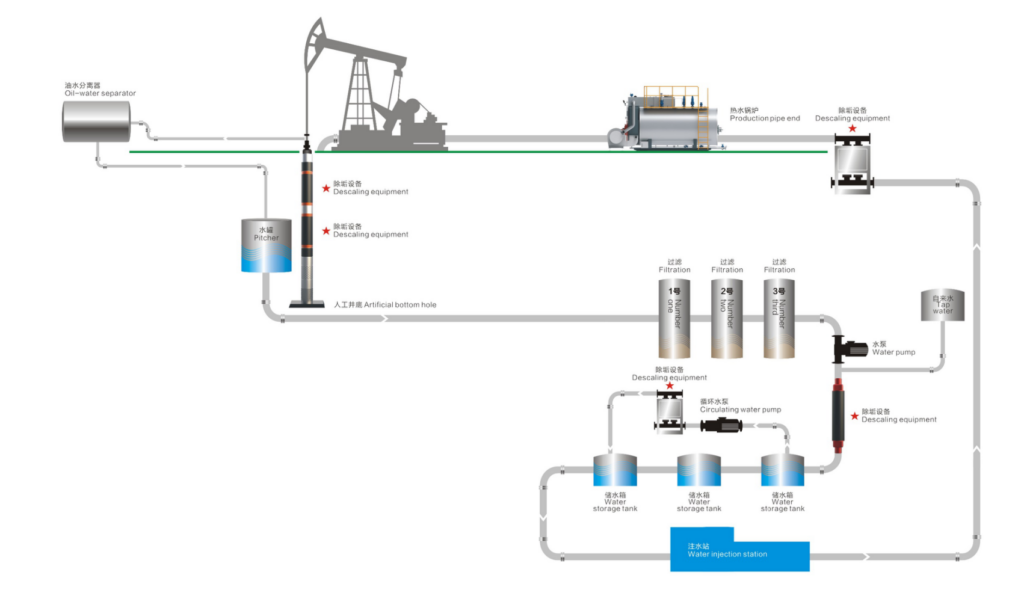 (4) Due to the increase in dipole distance of water molecules in the rinjection water, the attraction between water molecules and salt positive and negative ions increases, leading to the gradual cracking, loosening, and self detachment of existing old scale on the heating surface or pipe wall, as well as sedimentary scale in the reservoir.